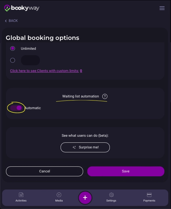 Automation Setting: Check if the “waiting list automation” option is active. If this setting is disabled, the system won’t automatically move clients from the waiting list to available slots. (see image)