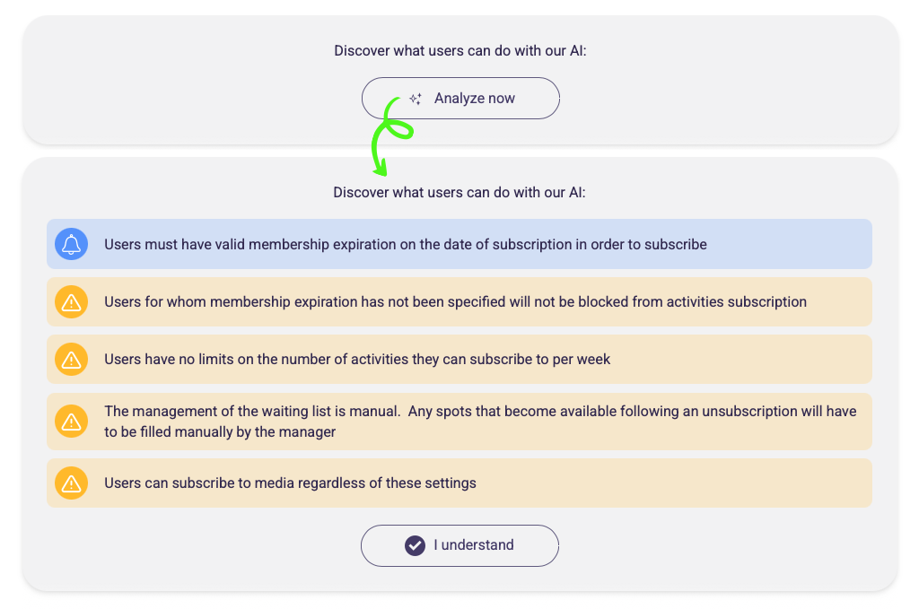 If you want to check which activities a user can sign up for, considering not only subscription expiration but also other restrictions (e.g., certificates, personalized expiration dates, weekly limits), you can use the ANALYZE NOW button in the user’s profile. The AI will provide a detailed and simplified list of available sign-ups.