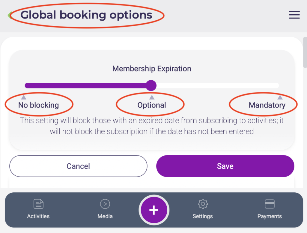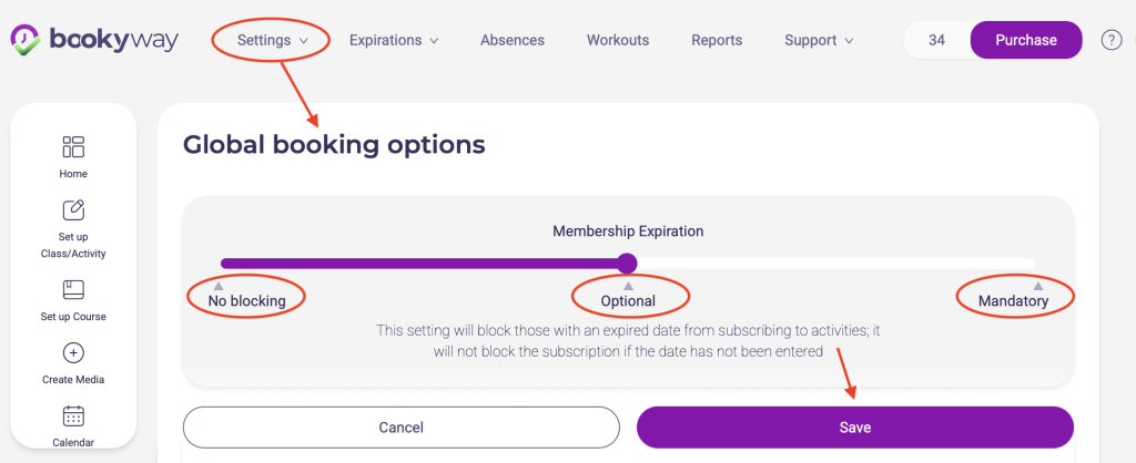 In the Settings → Global Booking Options menu, you can choose how to manage sign-ups based on subscription expiration. The available options are: