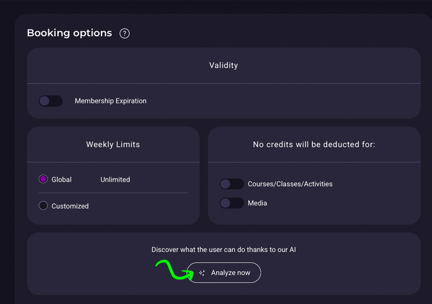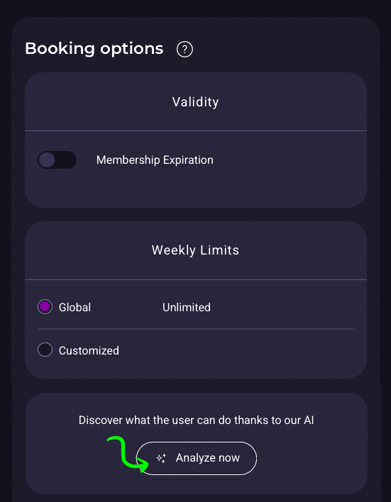 If you have doubts about configuring user booking options or global booking settings, use the Analyze now button. Thanks to artificial intelligence, it will provide you with insights into the impact of your changes.