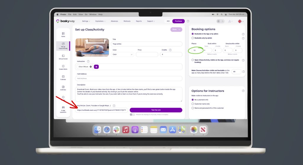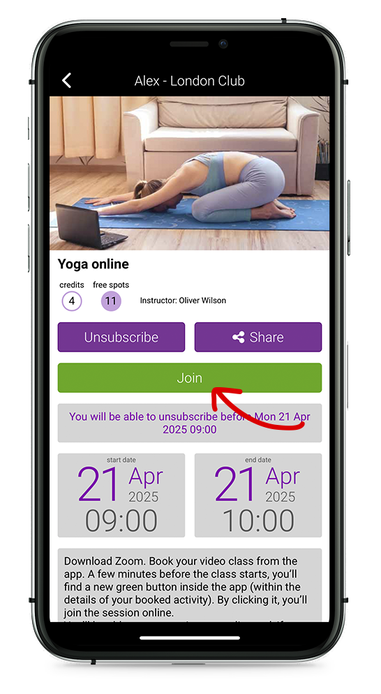 If you want, copy the following text to add to the lesson details: “Download Zoom. Book the video lesson from the App. In the details of your booked activity, you will find a new green button. By clicking it, you will connect online. You will be able to see your instructor in “LIVE” mode and, if you wish, talk to them or show them if you are performing the exercise correctly.”