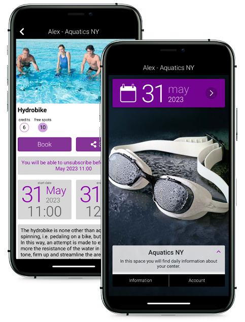 With this Bookyway’s Aquatics management system you can create a schedule of all your activities: Swimming Courses, Aquagym, Swim School, Aquatics for Babies, Swimming Courses for Children, Individual Swimming lessons, Hydrobike, Aquafitness, Crosswim, competitive training, Synchronized Swimming, Water Polo, Diving, and more!