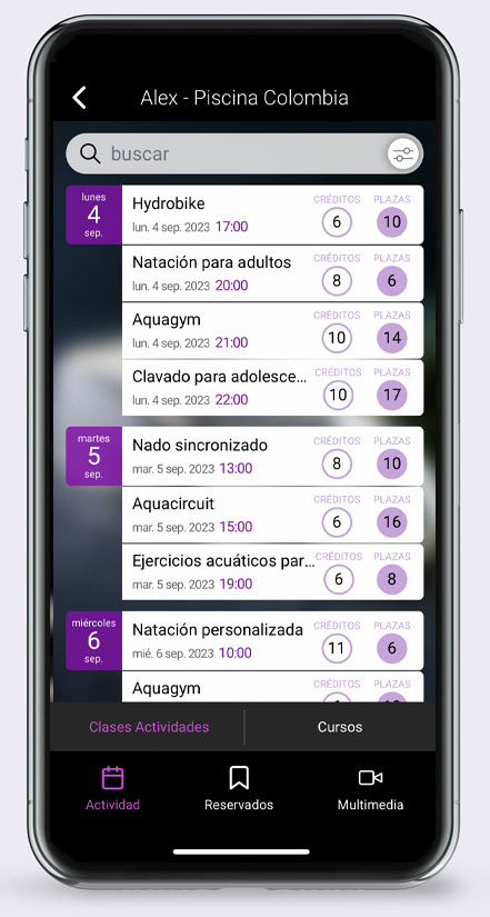 Permite a todos tus clientes ver tus cursos en su App para piscinas, así que ellos mismos puedan reservarlos o ponerse en lista de espera y después pagarlos a través de la App.