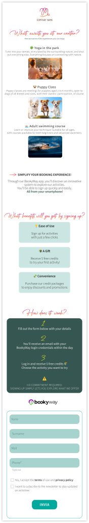 Para aprovechar al máximo BookyWay en la generación de nuevos leads, necesitas preparar una página de aterrizaje en tu sitio web donde los clientes potenciales puedan solicitar fácilmente su inscripción.