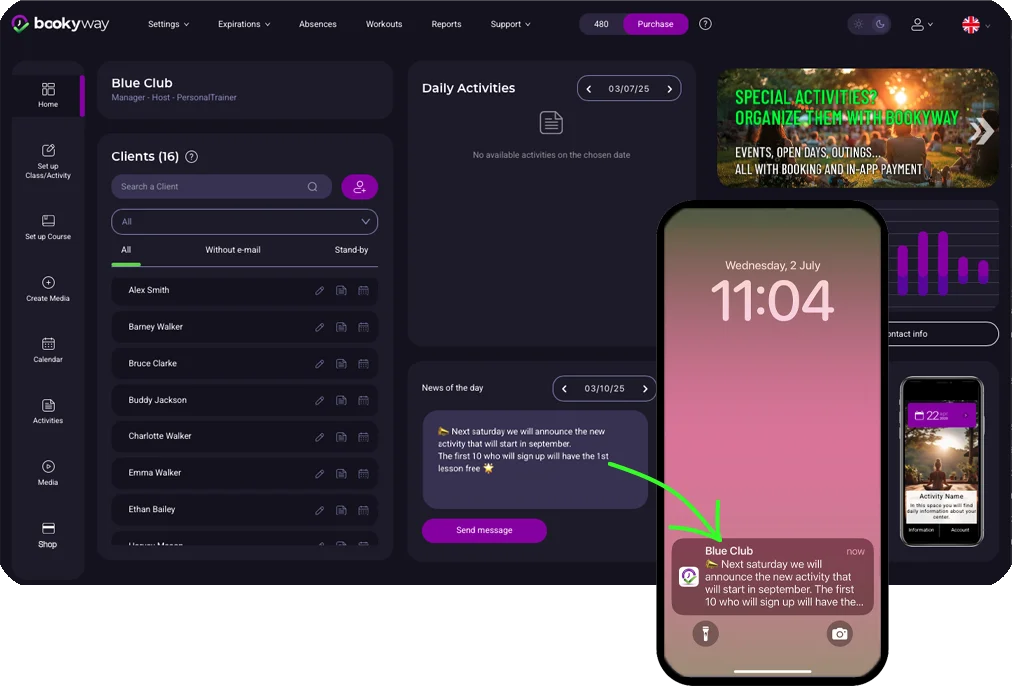📢 Avec BookyWay, vous pouvez envoyer des messages rapides et efficaces directement aux utilisateurs de l’application, en maintenant toujours une connexion claire et professionnelle.