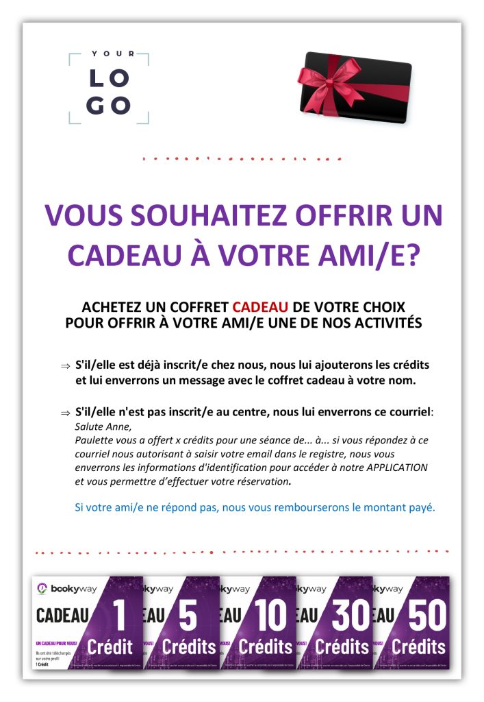 Imprimez et placez dans votre Centre l’affiche (éditable) que vous trouverez sur cette page pour encourager vos clients à offrir des crédits à leurs amis !