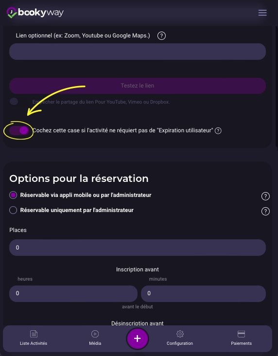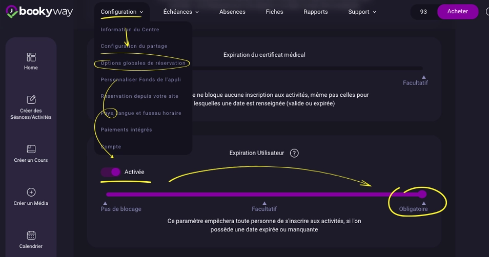 Avec ces paramètres, les clients avec une échéance expirée ou sans date définie ne pourront pas s’inscrire aux activités publiées.