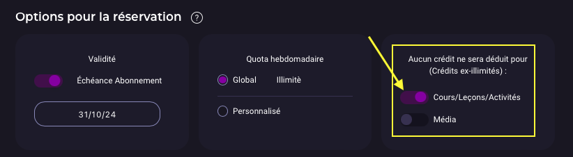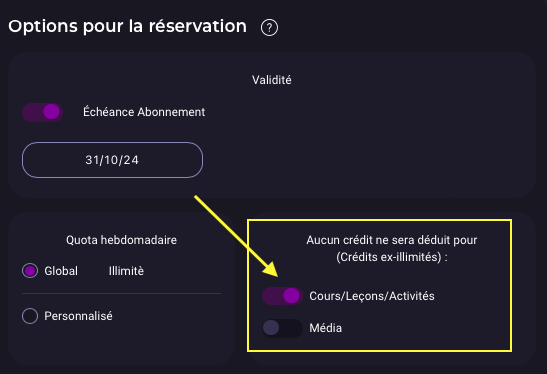 Je peux également décider dans ce cas de fixer un nombre maximum d’activités que le client peut faire par semaine grâce aux « Quota hebdomadaire« .