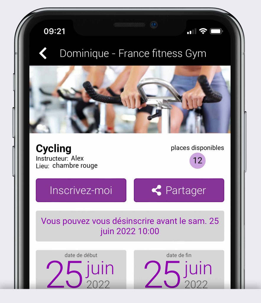 Permettez à tous vos clients de voir ces activités dans l’application de leur salle de sport et de réserver ou de se mettre sur la liste d’attente ou de payer directement via l’appli fitness.