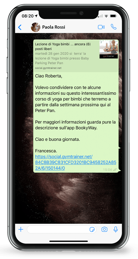 Con BookyWay sia i tuoi clienti che tu potrete condividere le informazioni di una delle tue tante attività via sms, whatsapp, facebook, e-mail, insomma attraverso lo strumento che preferisci per far conoscere velocemente a tanti potenziali clienti tutti i tuoi corsi.