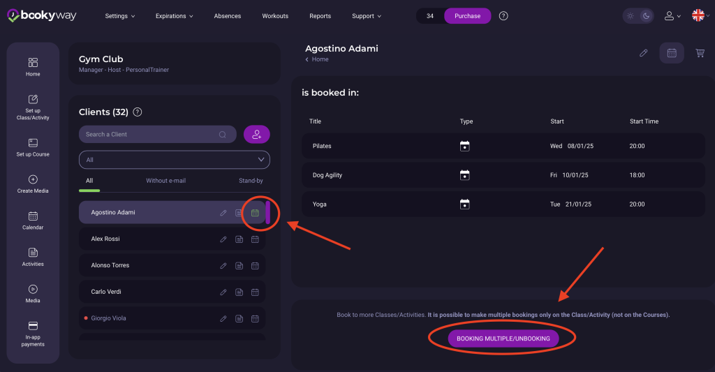Per gestire l’iscrizione o la disiscrizione di un cliente a più lezioni, segui questi passi: