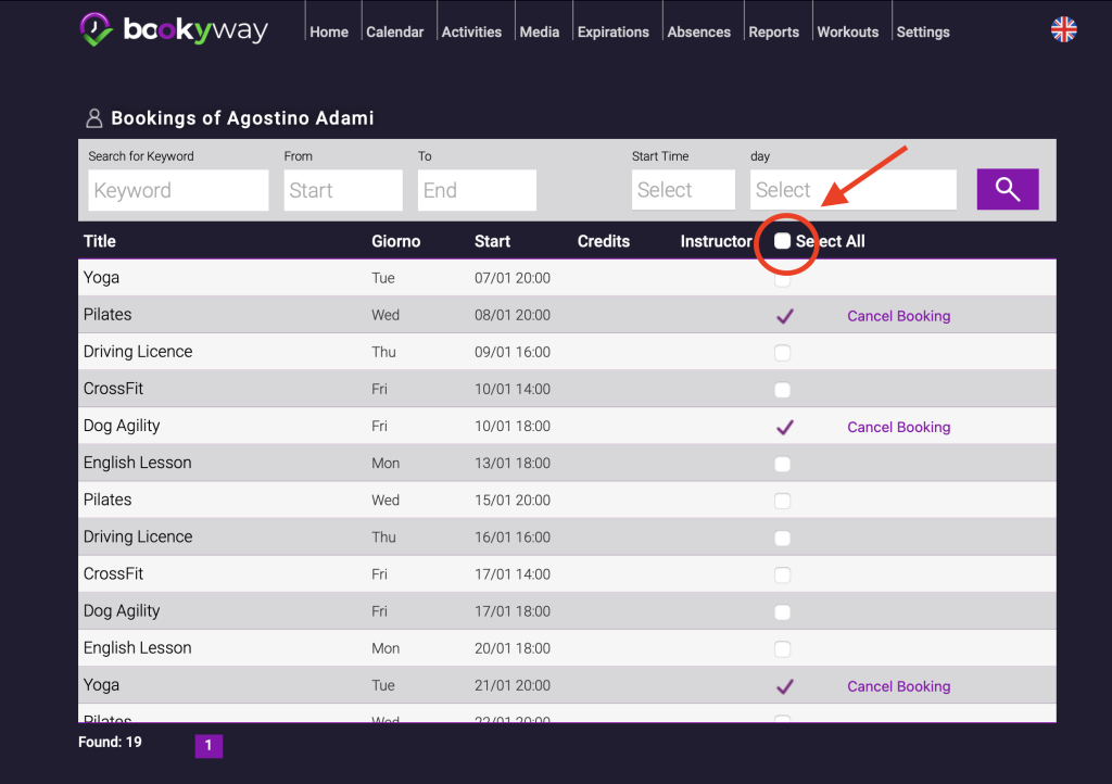 - Cliccando su questo pulsante, si aprirà una pagina con il tuo palinsesto. Le attività alle quali il cliente è già prenotato saranno evidenziate.