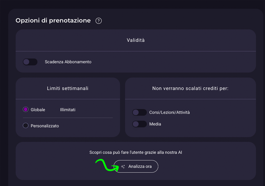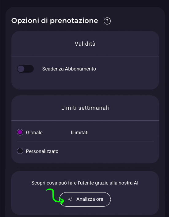 Se avete dubbi su come configurare le opzioni di prenotazione di un utente o le impostazioni globali di prenotazione utilizzate il bottone Analizza ora che grazie all’intelligenza artificiale vi sorprenderà dandovi informazioni sull’impatto che hanno le vostre modifiche.