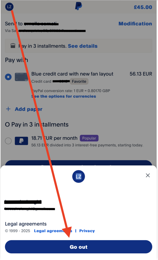 Per fare log out da PayPal cliccare in alto a sinistra sul tuo avatar (bottone con le tue iniziali) e poi clicca in basso il bottone Esci.
