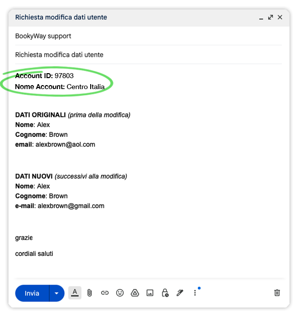 Se hai bisogno quindi di aggiornare questi dati, è necessario inviare una richiesta al supporto compilando l’email nel seguente formato: