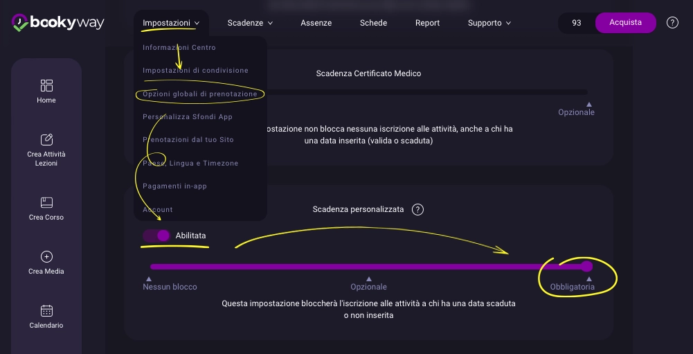 Modifichiamo le impostazioni entrando nel menu Impostazioni / Opzioni globali di prenotazione, dove hai la possibilità di attivare l’utilizzo della scadenza personalizzata.
