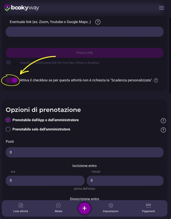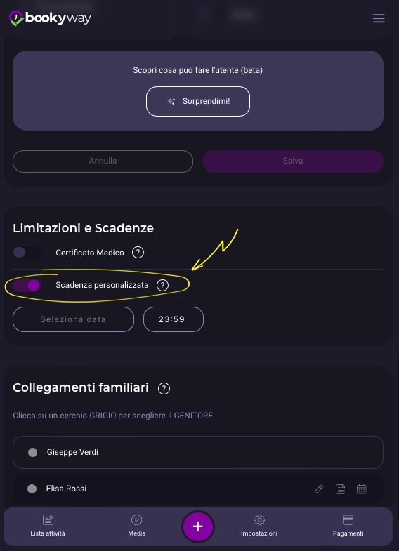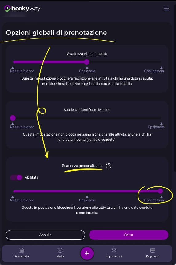 Con queste impostazioni i clienti con la data scaduta o senza data impostata non potranno iscriversi alle attività pubblicate.