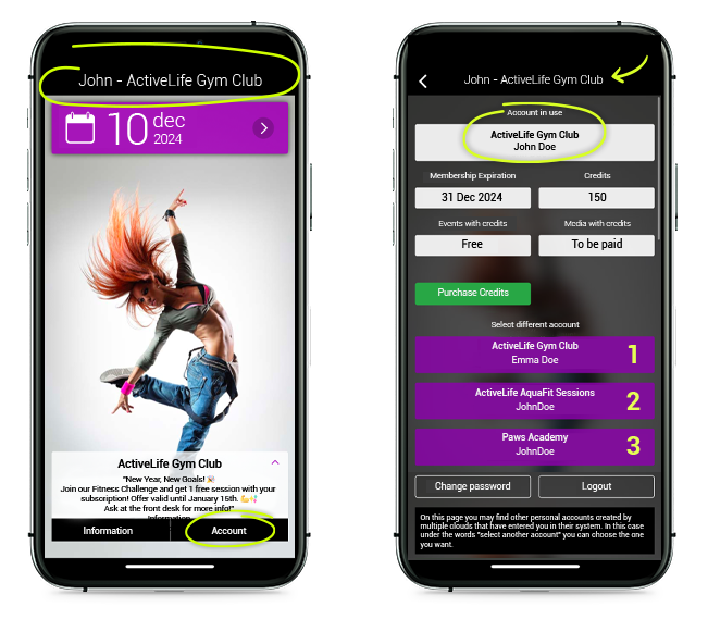 - Quando il cliente accede all’app con quell’email, nella sezione Account potrà passare da un utente all’altro.