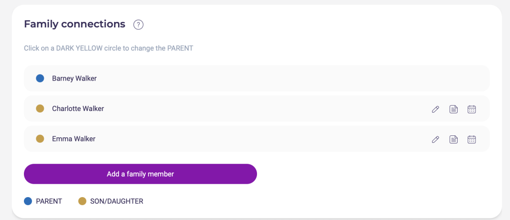 - Se necessario, puoi cambiare i ruoli cliccando di nuovo su un pallino giallo per assegnare il ruolo di genitore a un altro utente.