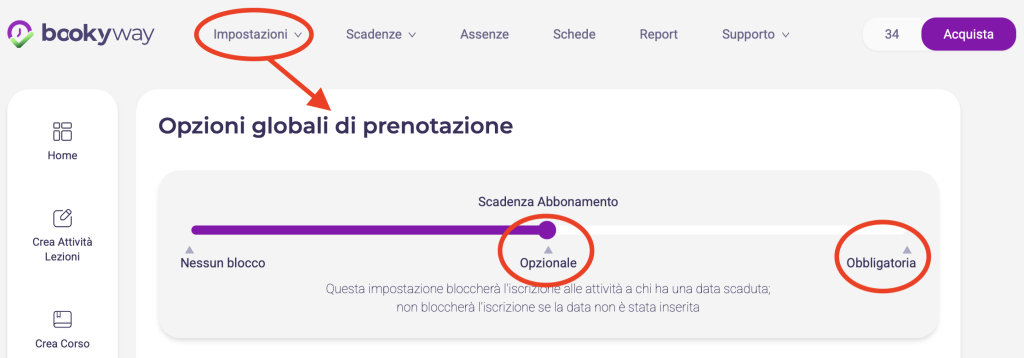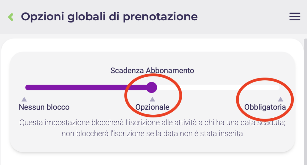 - Obbligatoria: sia gli utenti con un abbonamento scaduto che quelli senza un abbonamento (nessuna scadenza abbonamento impostata) non potranno iscriversi.