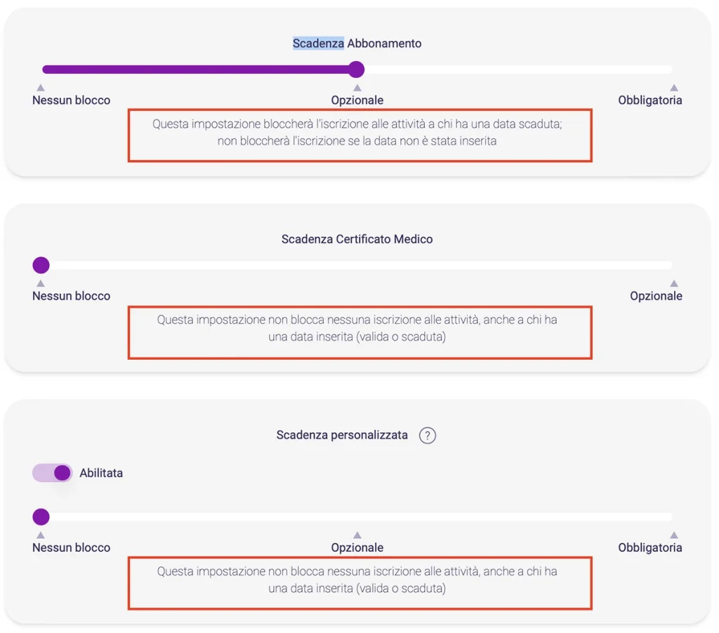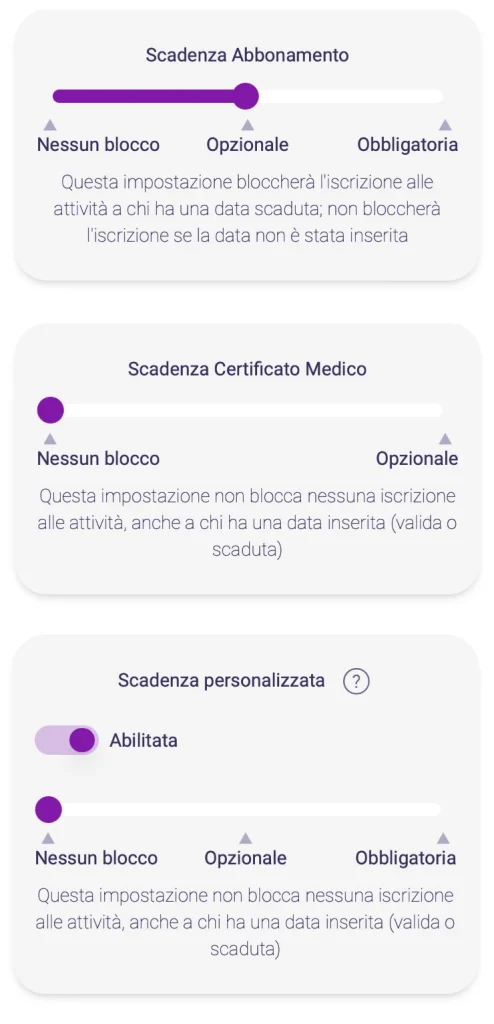 In questa pagina potrai modificare le scadenze dell’abbonamento, del certificato medico e della scadenza personalizzata.
