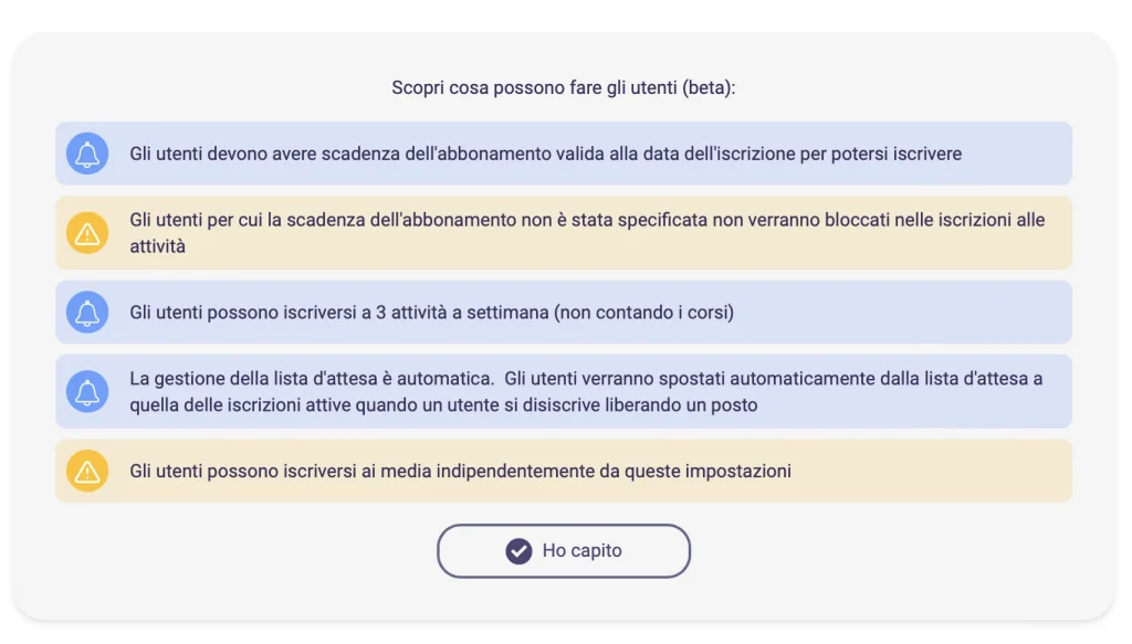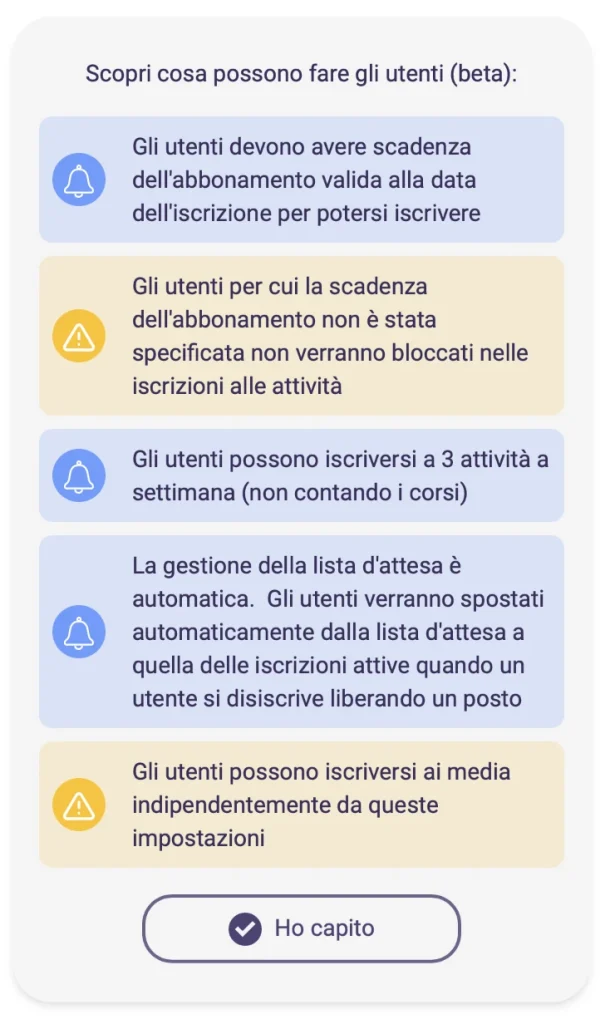 Potrete inoltre decidere se lasciare la lista di attesa con la funzionalità “automatica” o se impostarla in modalità “manuale”. Automatica significa che quando si liberano dei posti gli utenti in lista di attesa verranno automaticamente iscritti e avvisati; manuale significa che dovrà farlo manualmente l’amministratore.