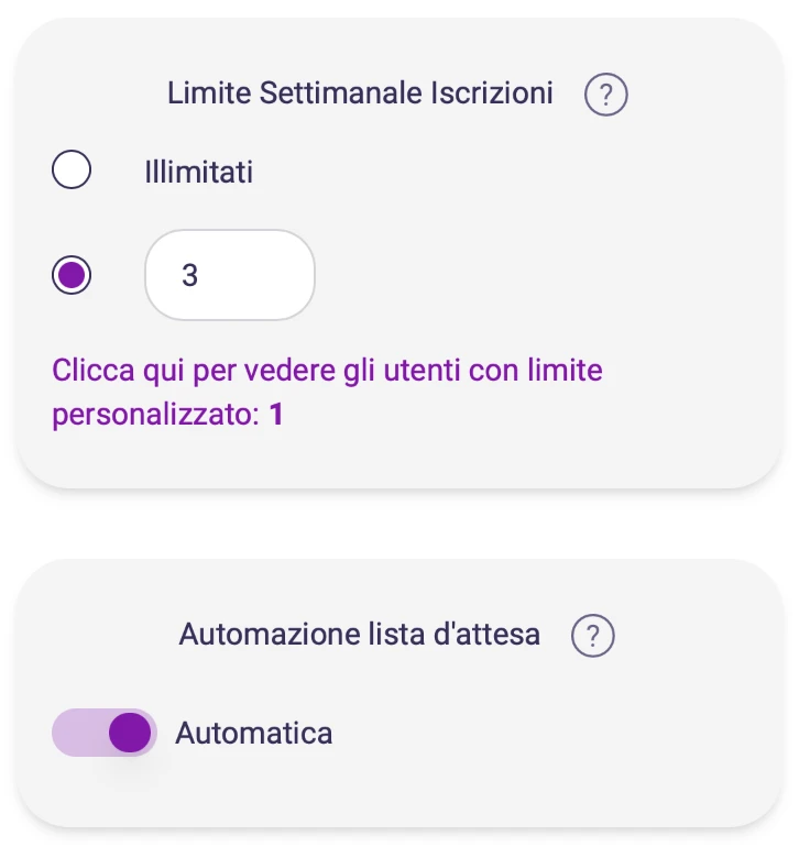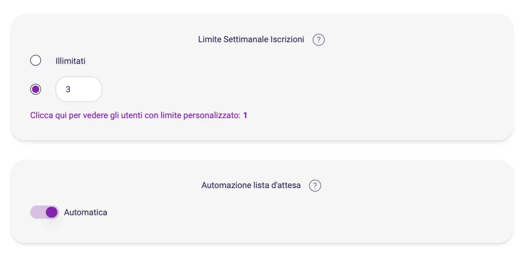 Sempre in questa pagina troverete l’impostazione del limite di iscrizione settimanale di iscrizioni (da lunedì a domenica) che può essere impostato per tutta l’anagrafica (potrà anche essere personalizzato per singolo utente entrando nel profilo dell’utente).