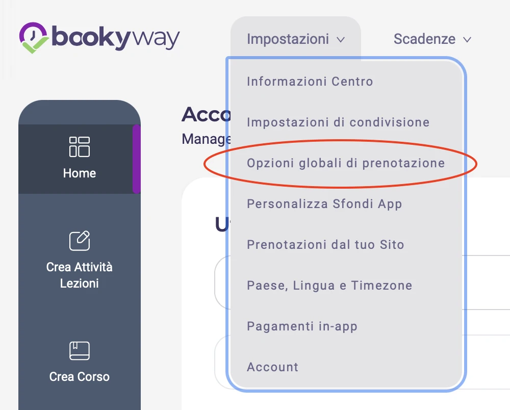 Abbiamo creato un nuovo menù chiamato “Opzioni globali di prenotazione” che sostituisce il vecchio menù “Impostazioni corsi lezioni attività” e il menù “Scadenze – Preferenze”