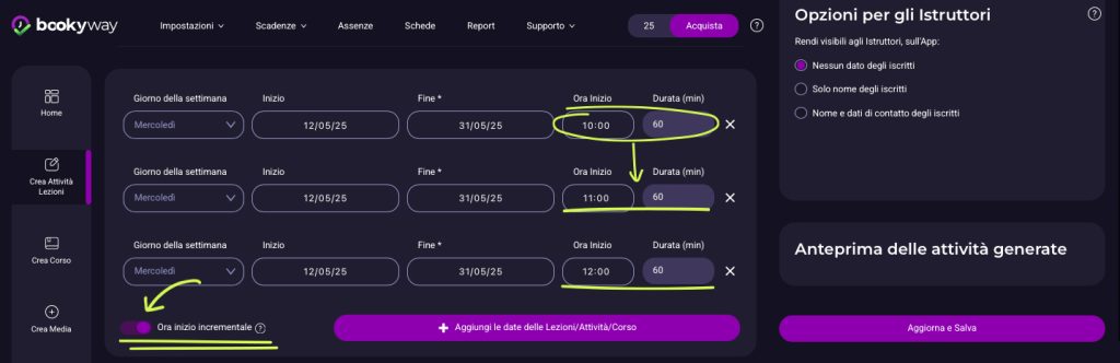 Nella sezione Crea Attività / Lezioni è disponibile la nuova opzione “Ora inizio incrementale”: