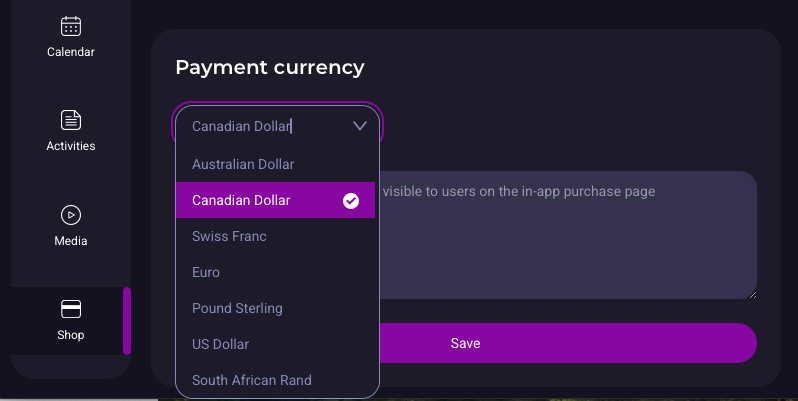 Seleziona la valuta dal menu Shop e consulta l’elenco delle valute disponibili.