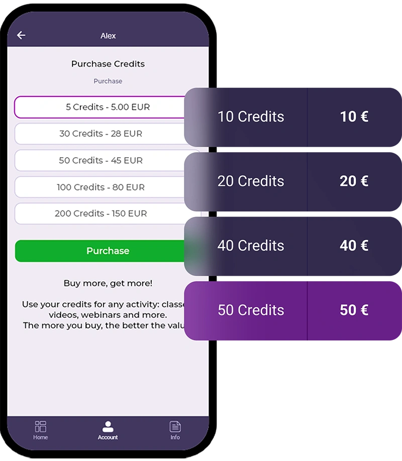 Clienții dvs. pot alege și achiziționa unul dintre pachetele de credite pe care le oferiți pentru a vă înscrie la activitățile dvs. Creditele vor fi încărcate automat în aplicația de rezervări a clientului, iar dvs. veți primi imediat fondurile în contul dvs. STRIPE.