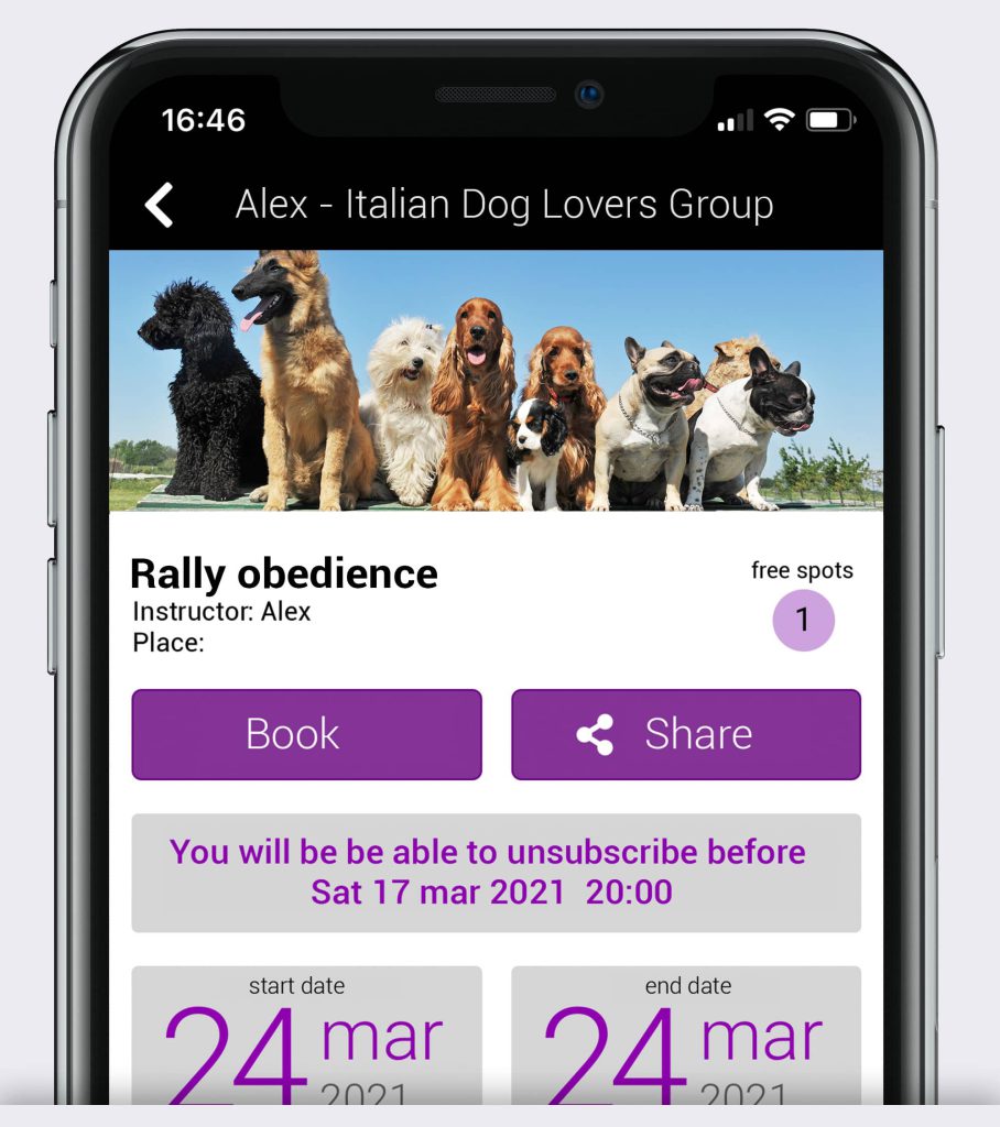 Allow all your customers to see your courses in their dog lovers app with description and photo of the activity and book or pay through in-app purchases.