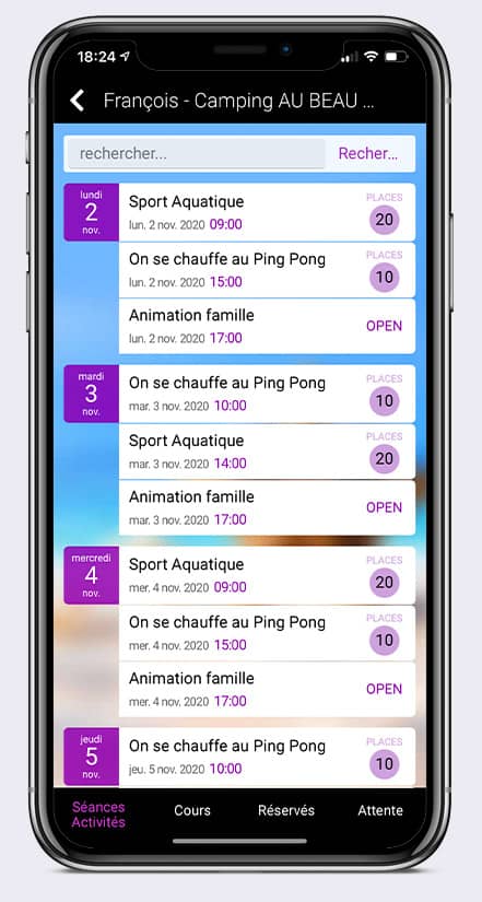 Permettez à tous vos clients, depuis leur appli mobile, de consulter les services de votre camping-village touristique, de lire le descriptif et d’ apprécier les photos de ces activités; ils pourront ensuite, toujours au moyen de l’appli mobile, réserver ou se mettre en liste d’attente pour les activités choisies.