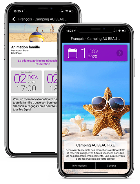 Permettez à tous vos clients, depuis leur appli mobile, de consulter les services de votre camping-village touristique, de lire le descriptif et d’ apprécier les photos de ces activités; ils pourront ensuite, toujours au moyen de l’appli mobile, réserver ou se mettre en liste d’attente pour les activités choisies.