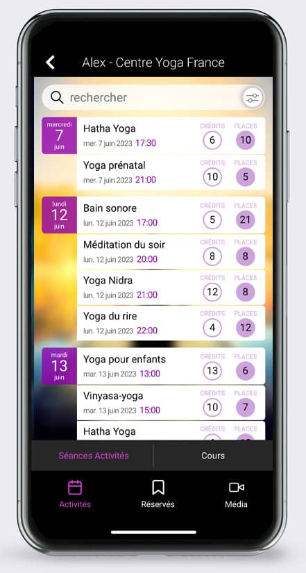 Permettez à tous vos clients de voir vos cours dans leur application de yoga et de réserver ou de s’insérer dans la liste d’attente et de payer via l’application.