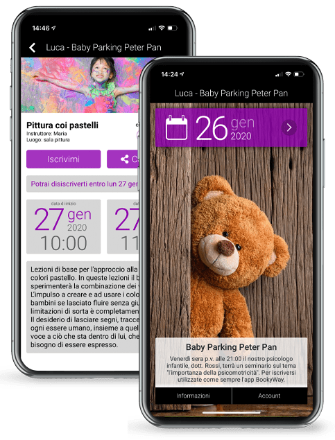 Con BookyWay puoi creare il palinsesto di tutte le attività e i corsi che tieni per i figli dei tuoi clienti all’interno del tuo baby parking o asilo o ludoteca: