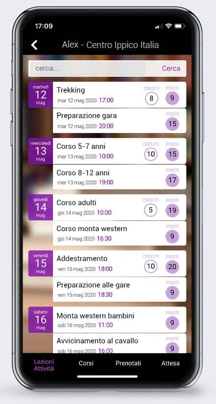 Metti nel calendario di BookyWay le attività della tua scuola di equitazione. Il cliente le vedrà in tempo reale e potrà iscriversi direttamente dall’app