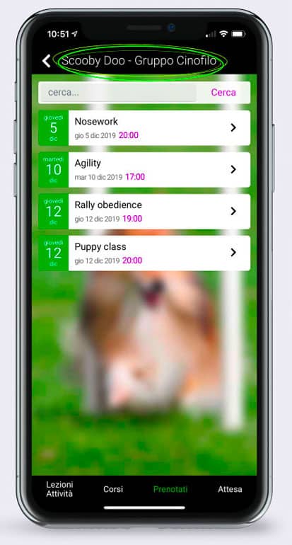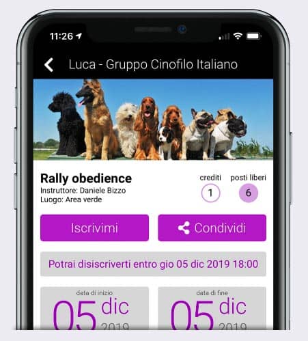 Permetti a tutti i tuoi clienti di vedere i tuoi corsi nella loro app per cinofili con descrizione e foto dell’attività e di prenotare o pagare attraverso gli acquisti in-app.